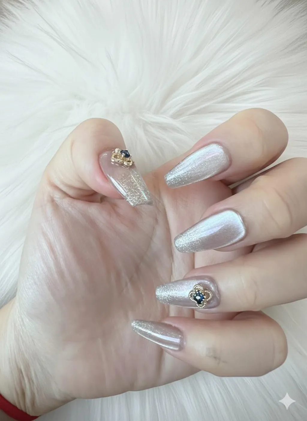 Design: Nude beige + glitter gradation at the tip + navy and gold accent parts