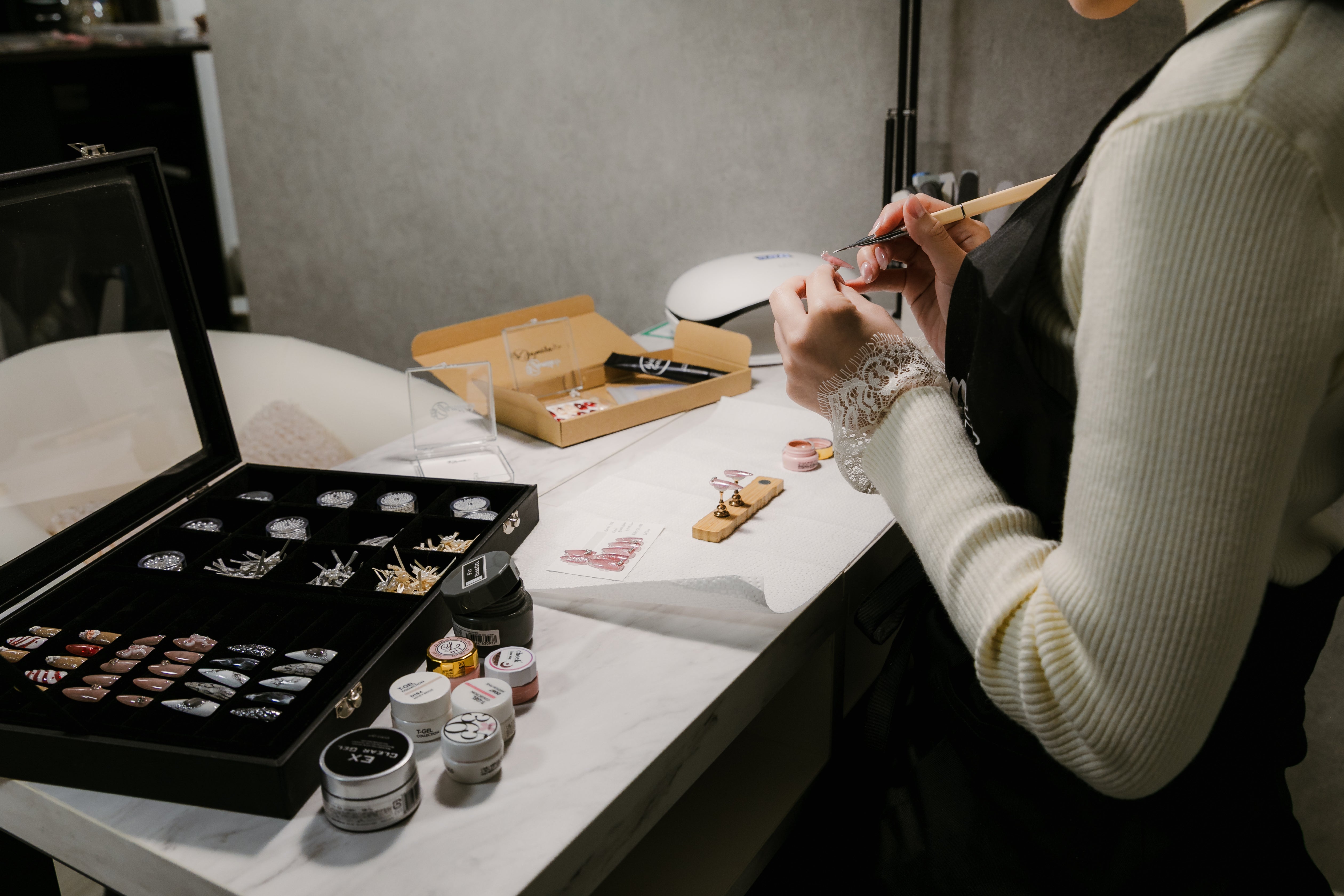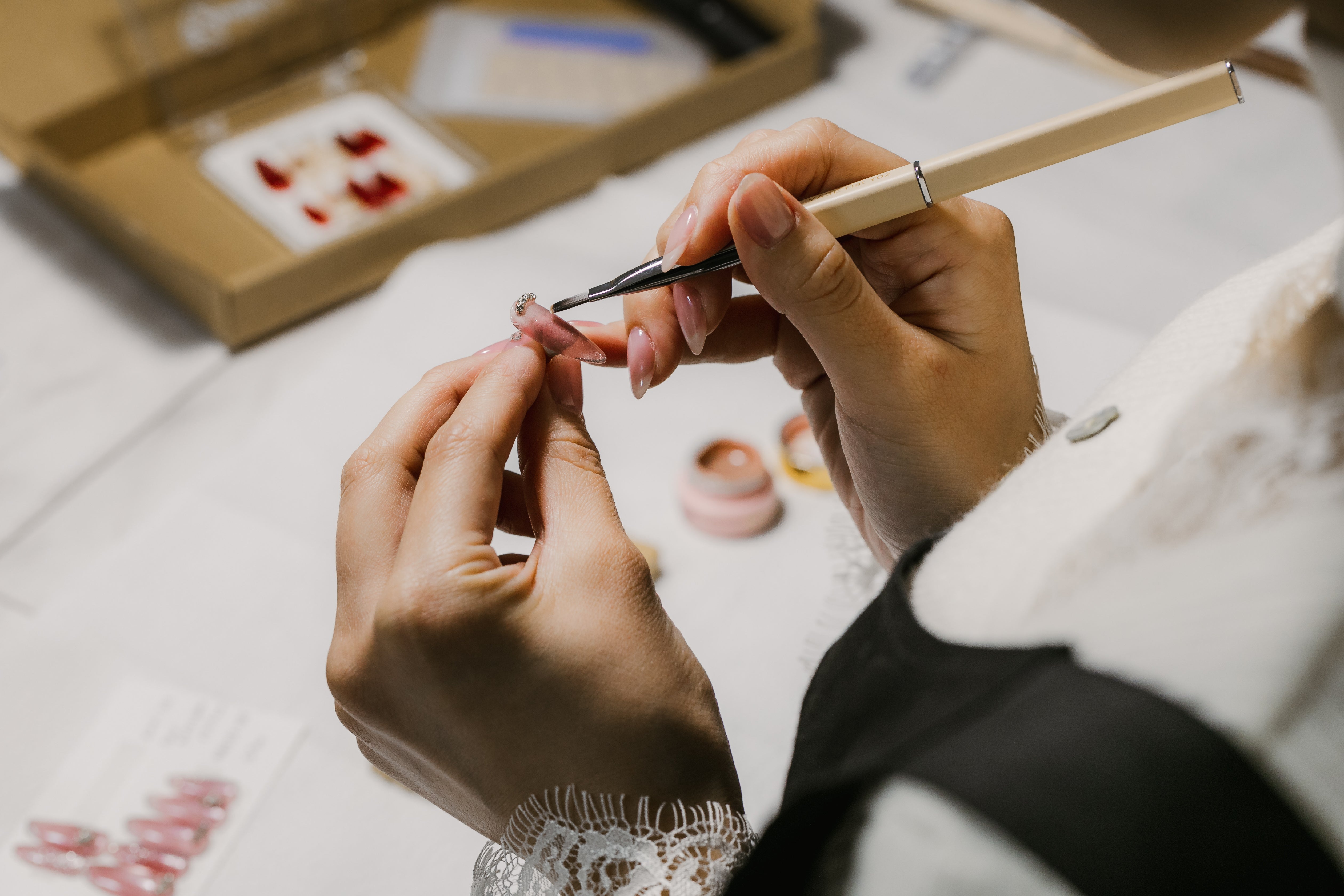 ご注文ごとに、チップの選定から仕上げ、最終検品まで。すべてをサロン基準で管理し、職人の手仕事で一組ずつ仕立てます。指先ごとの微差に寄り添う独自サイズ理論と形状記憶チップにより、装着した瞬間から、自然なフィット感と仕立てた直後の完成度を。