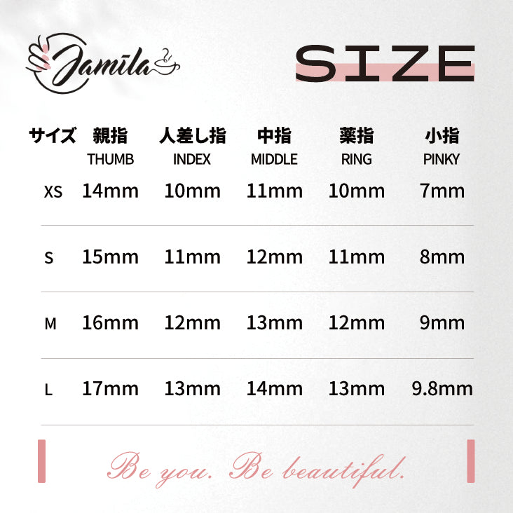 Jamilaのネイルチップは PERFECT FIT を大切にし、指一本ずつフィットするように制作しています。
